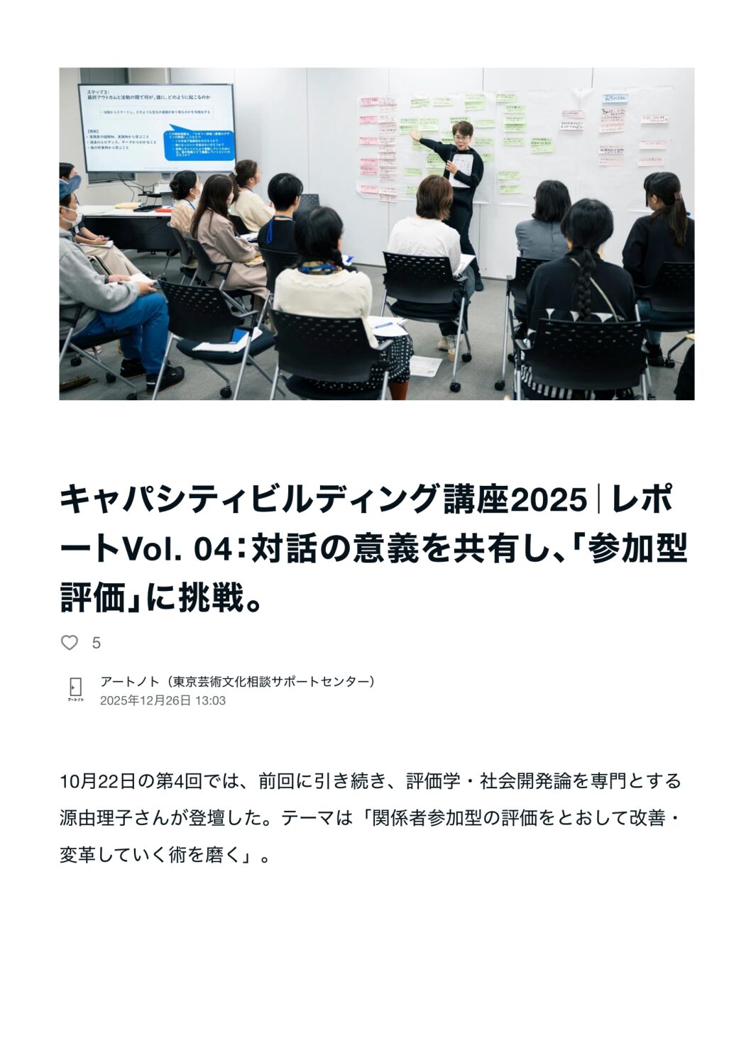 共同代表の源由理子が講師を務めた「キャパシティビルディング講座2025」(10/22)のレポートVol.04が公開されました(12/26)。